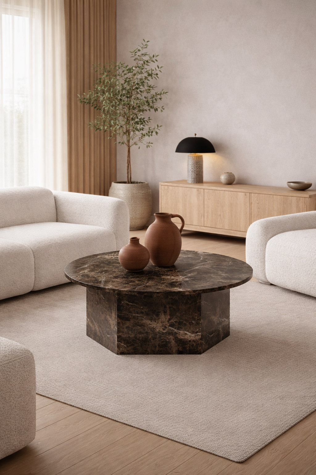 HEXA kohvilaud kuulub meie ikoonilisse HEXA perekonda, kus kohtuvad puhas geomeetria ja skulpturaalne jõulisus. Ümmargune lauaplaat toetub tugevale hexagoni kujulisele jalale, luues tasakaalustatud ja pilkupüüdva terviku. See on disainitud ruumi keskpunktiks – selle arhitektuurne vorm ja selged jooned annavad interjöörile iseloomu, säilitades samal ajal ajatu ja minimalistliku elegantsi. Tänu oma läbimõeldud proportsioonidele sobib laud nii modernsetesse kui ka klassikalistesse eluruumidesse.