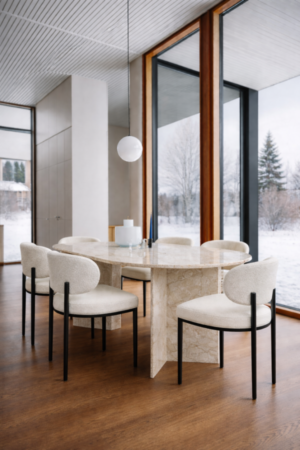 JANE söögilaud Marmorist on elegantse, ovaalse lauaplaadi ja kahe kolmnurkse jalaga kaunis, lihtne ja ajatu söögilaud. Oma puhaste joonte ja moodsa siluetiga täiendab Jane laud sujuvalt erinevaid interjööri stiile, alates skandinaavialikust kuni kaasaegsete trendideni. Ovaalne söögilaud Jane sobib suurepäraselt nii pidulikeks õhtusöökideks kui ka lõõgastavateks perekondlikeks toidukordadeks. See on täiuslik kombinatsioon funktsionaalsusest ja luksusest, mis lisab teie söögitoale stiili ja elegantsi.